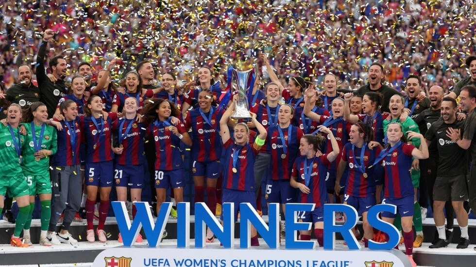 Les joueuses de Barcelone célèbrent avec le trophée après avoir remporté la finale de la Ligue des champions féminine de l’UEFA entre le FC Barcelone et l’Olympique Lyonnais au stade San Mames de Bilbao, le 25 mai 2024. © Pierre-Philippe Marcou, AFP. Source: France 24